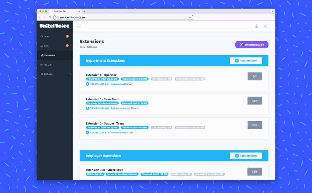 Give everyone on your team their own employee extension and set up department extensions to ring multiple phones across all locations.