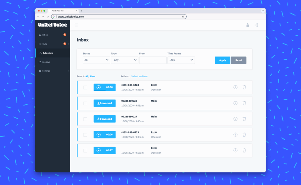 Miss a call? Set up custom voicemail boxes to capture important messages and have them transcribed and sent to your App or email.